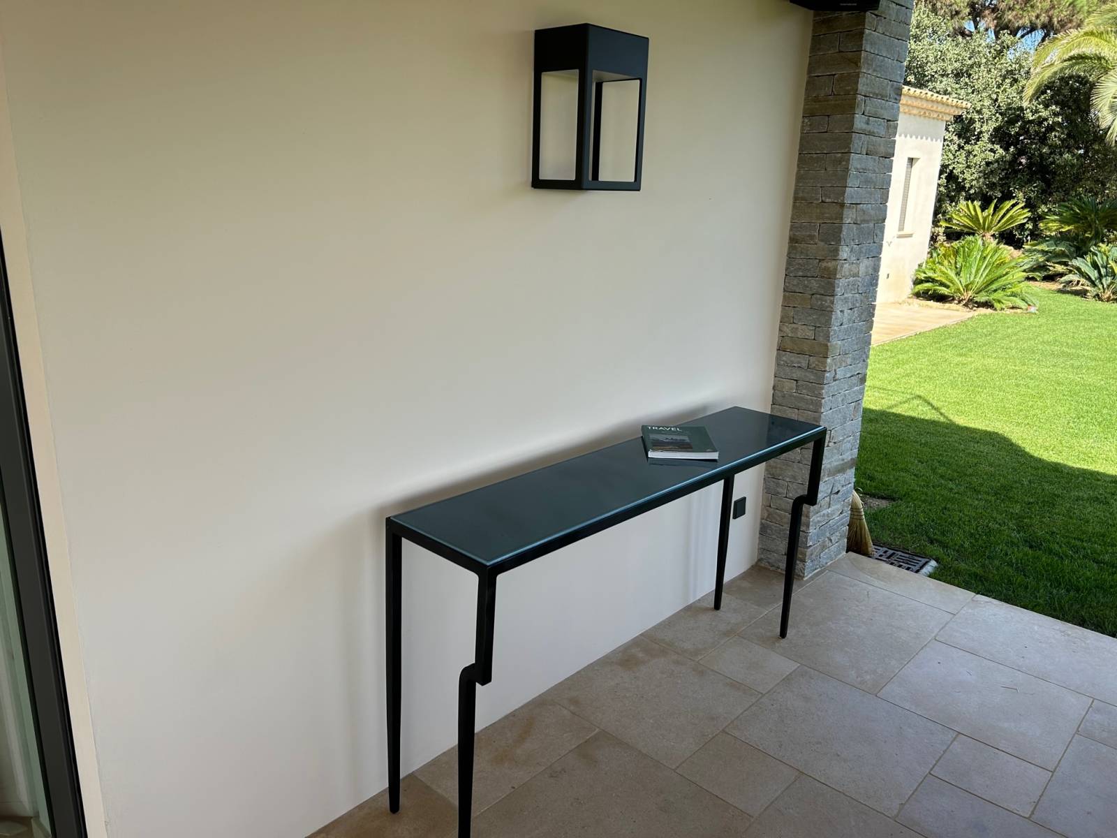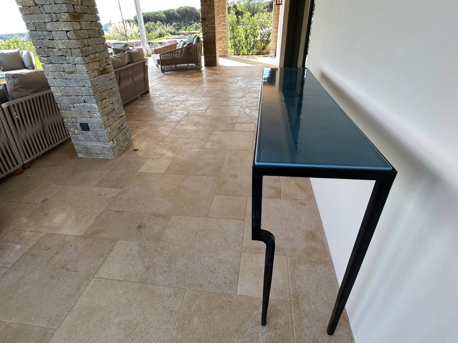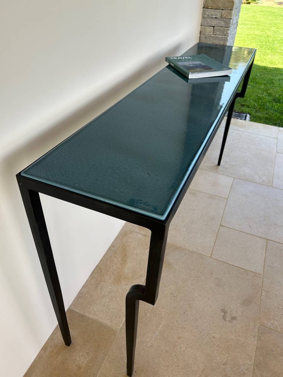 Réalisation d'une console moderne en pierre de lave émaillée par notre atelier LAVASTONE à Toulon, avec un piètement stylisé avec deux pieds décalé en fer forgé tels des pieds d'une girafe.