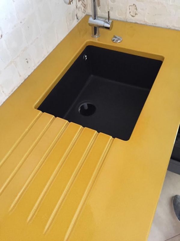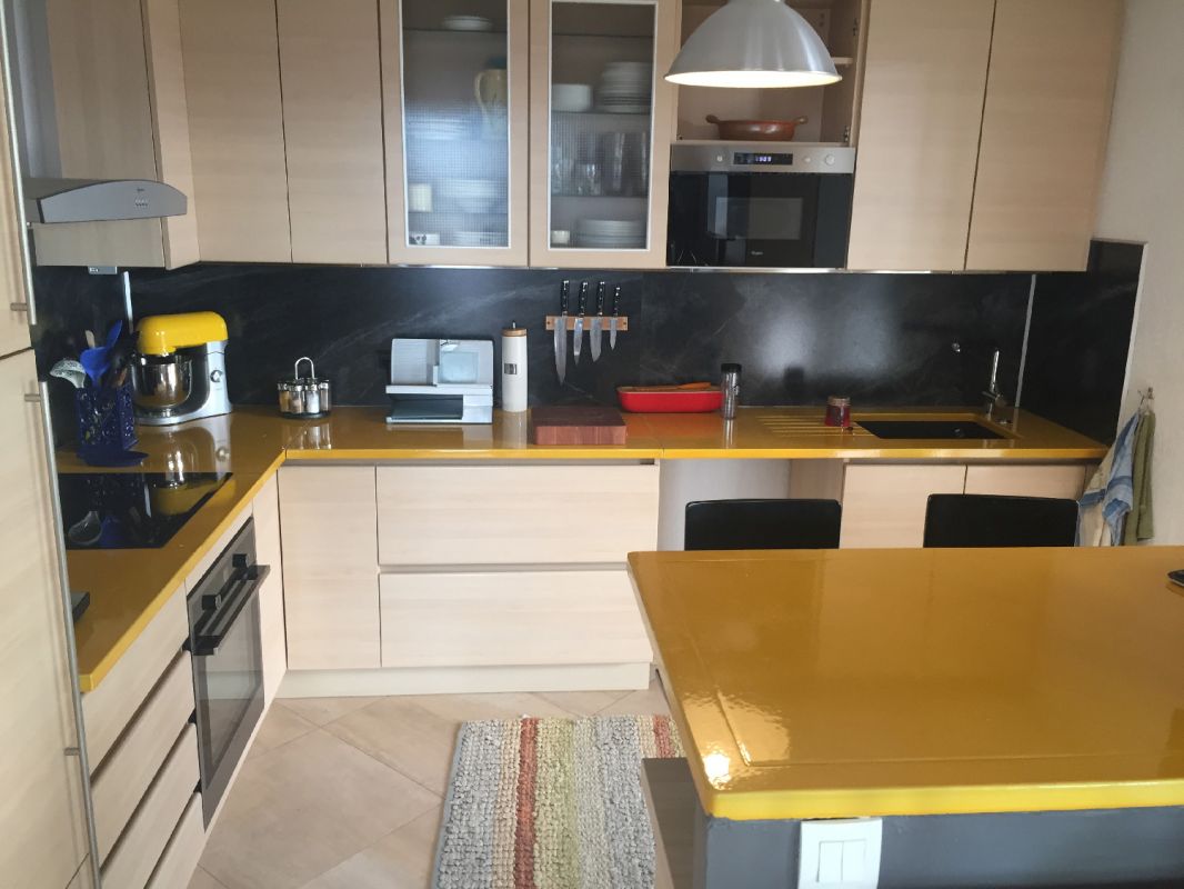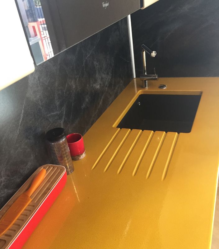 Monsieur D. a procédé à la dépose des plans de travail et nous avons réalisé les plans de travail et l'ilôt de cuisine en lave émaillée jaune tournesol.Monsieur D. a procédé à la dépose des plans de travail et nous avons réalisé les plans de travail et l'ilôt de cuisine en lave émaillée jaune tournesol.
