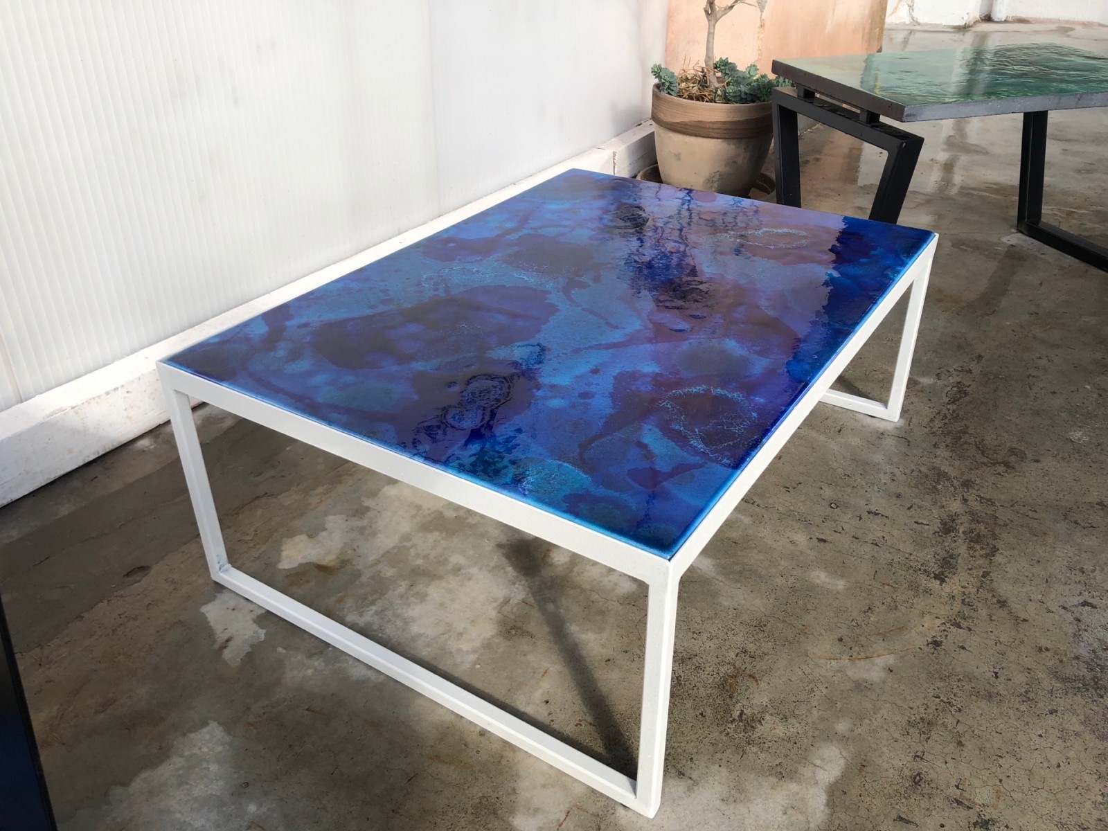 LAVASTONE a créé cette table basse design unique avec des nuances d’émail bleu.
