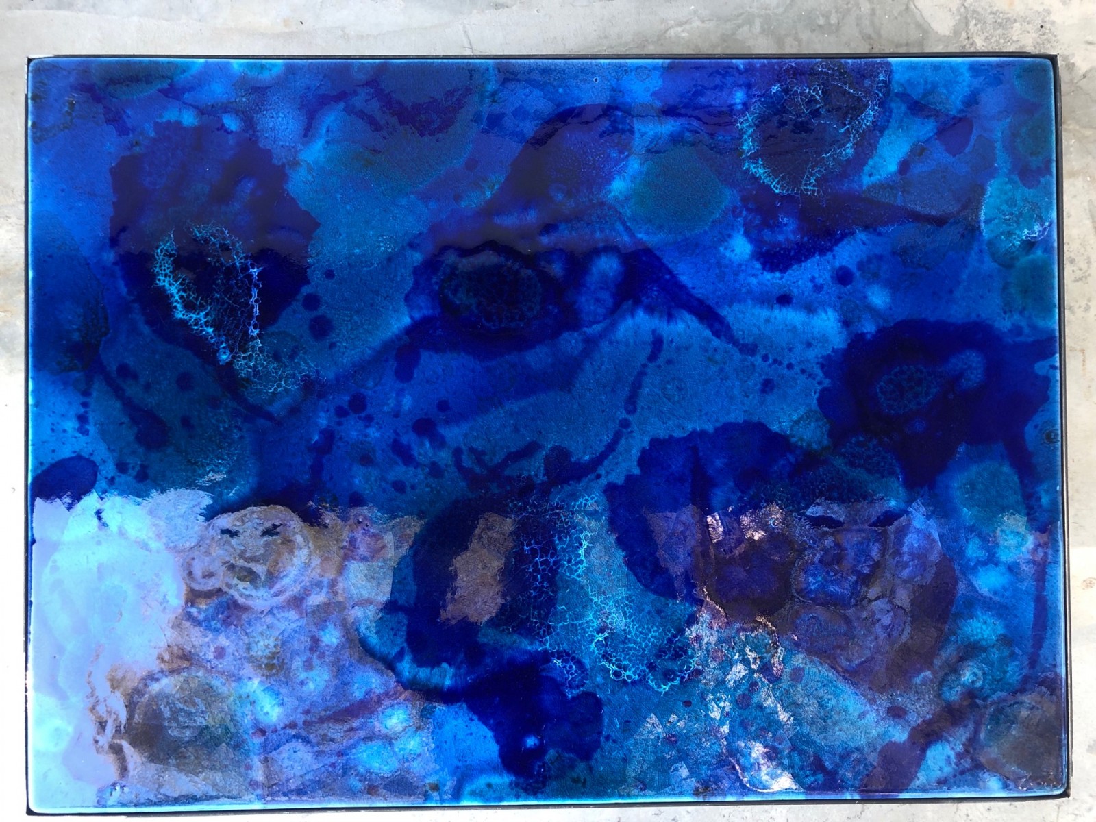 Le mélange d'émail de plusieurs bleus sur la lave émaillée donne des motifs éclatants.