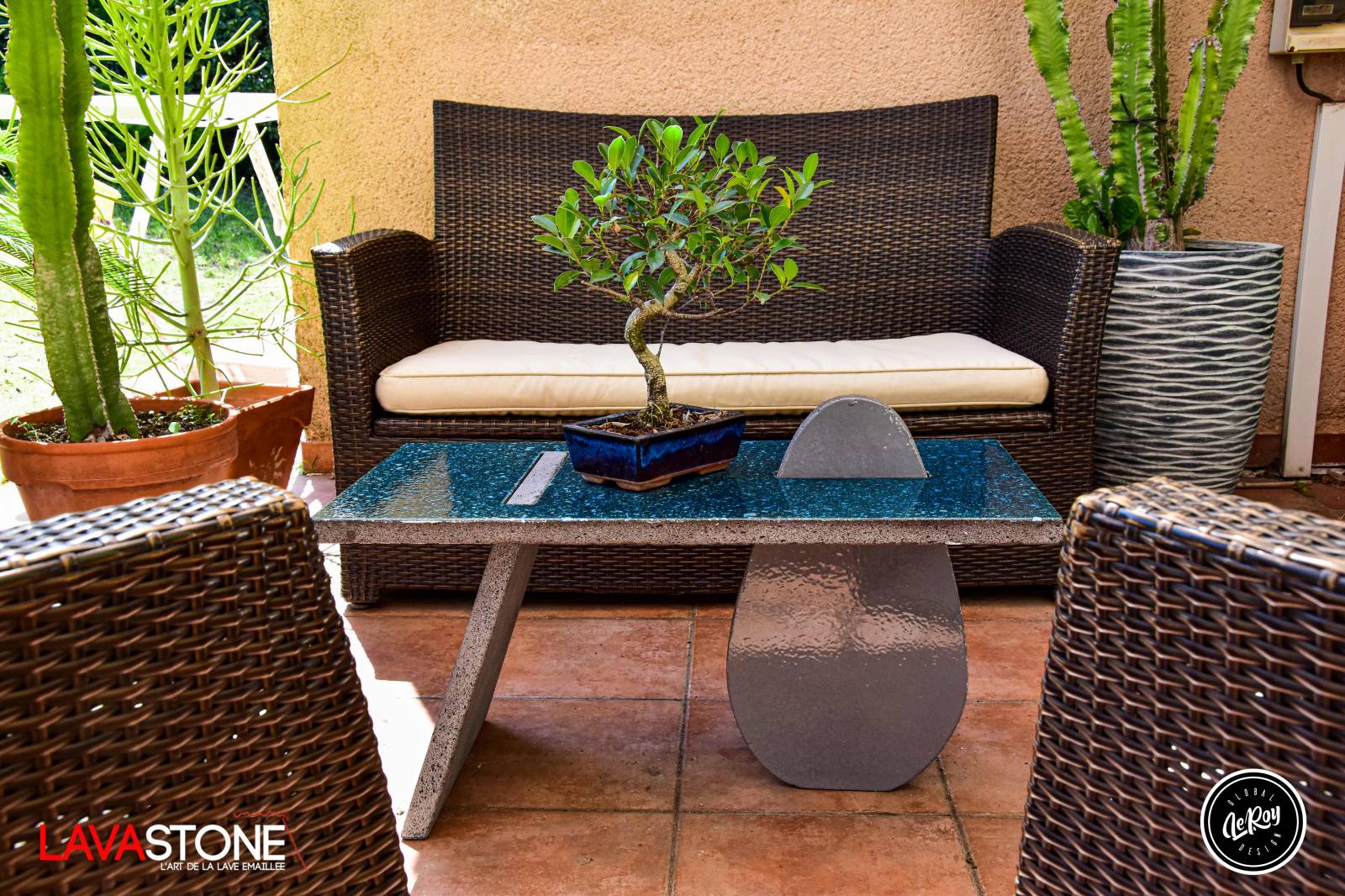 Cette pièce d'exception, assemblée avec soin à partir de pièces en lave émaillée et en lave brute, est spécialement étudiée pour maintenir son équilibre parfait. Elle se fondra harmonieusement dans un environnement extérieur, près d'une piscine par exemple, mais peut également être utilisée en intérieur comme une table d'appoint ou en bout de canapé.
