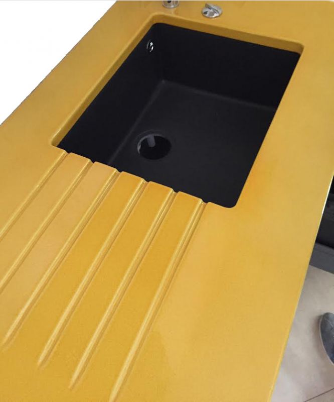 Plan de travail en pierre de lave émaillée couleur jaune tournesol avec un évier par dessous en résine noir et un égouttoir avec stris taillé dans la masse.