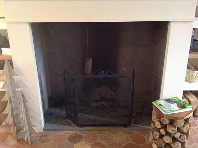 La lave émaillée est de couleur blanc coquille et le fond de cheminée en lave brute.
