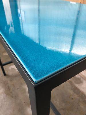 L'atelier LAVASTONE à Toulon a réalisé ce MANGE DEBOUT en pierre de lave émaillée, avec un piétement DROIT. Le plateau est enchâssé dans le pied réalisé également sur mesure.