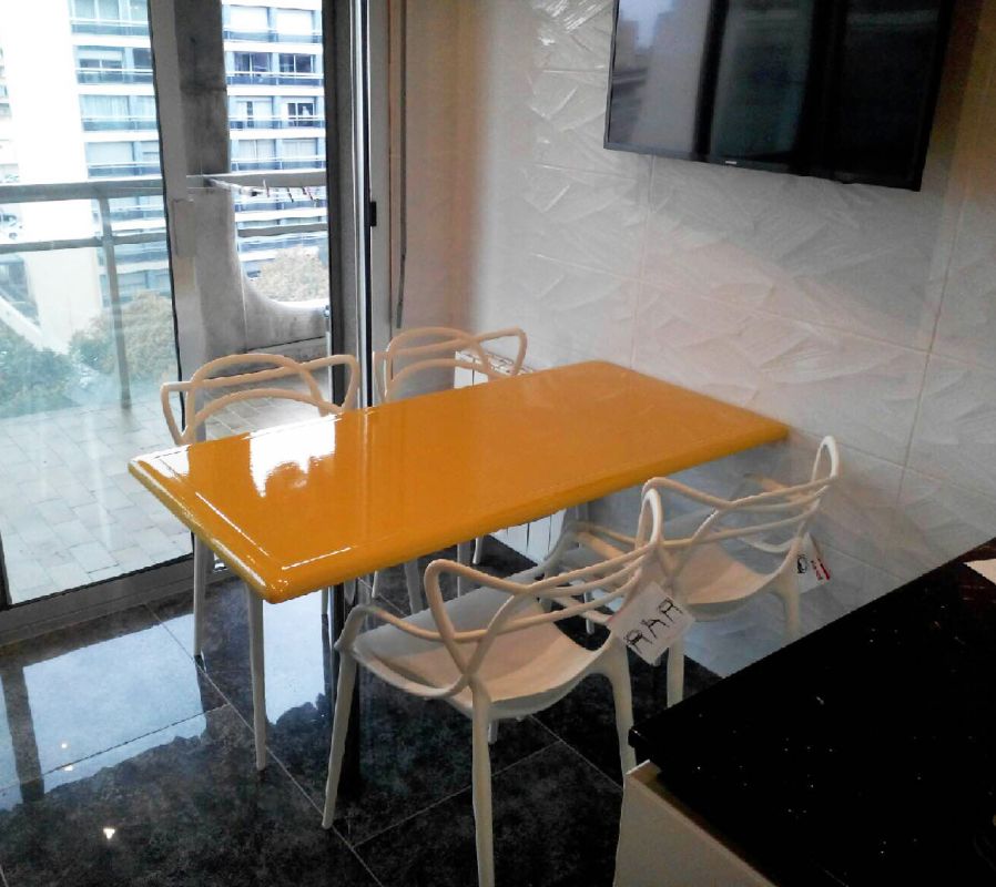 Cette table sert de plan de travail également et s'utilise en table pour le petit déjeuner, la cliente pourra préparer tout les plats et couper tout les aliments dessus.