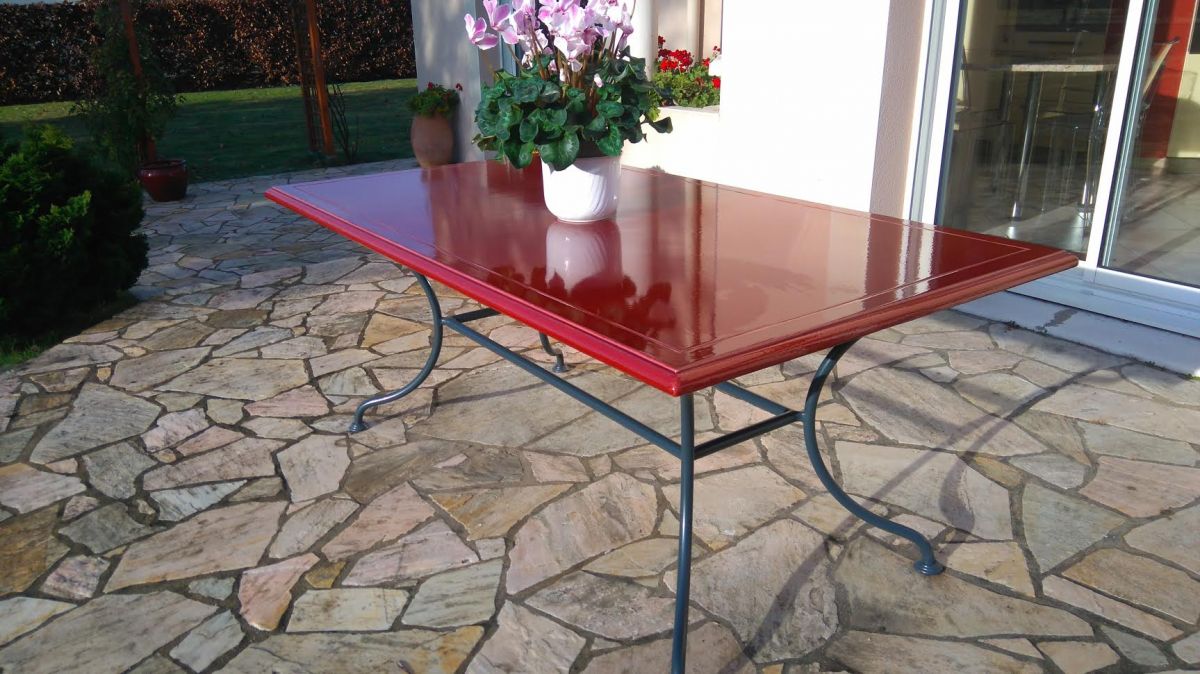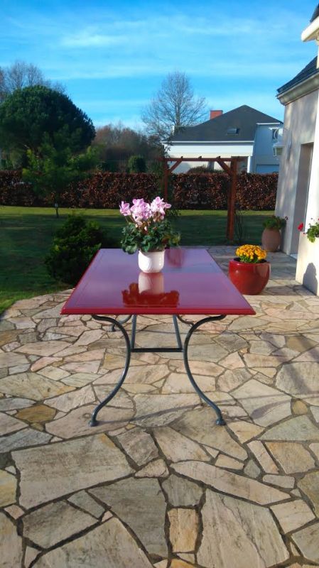 L'atelier Lavastone a réalisé une table avec plateau de 180 x 100 cm couleur terre brune avec bec de Corbin sur piétement type Elégance.