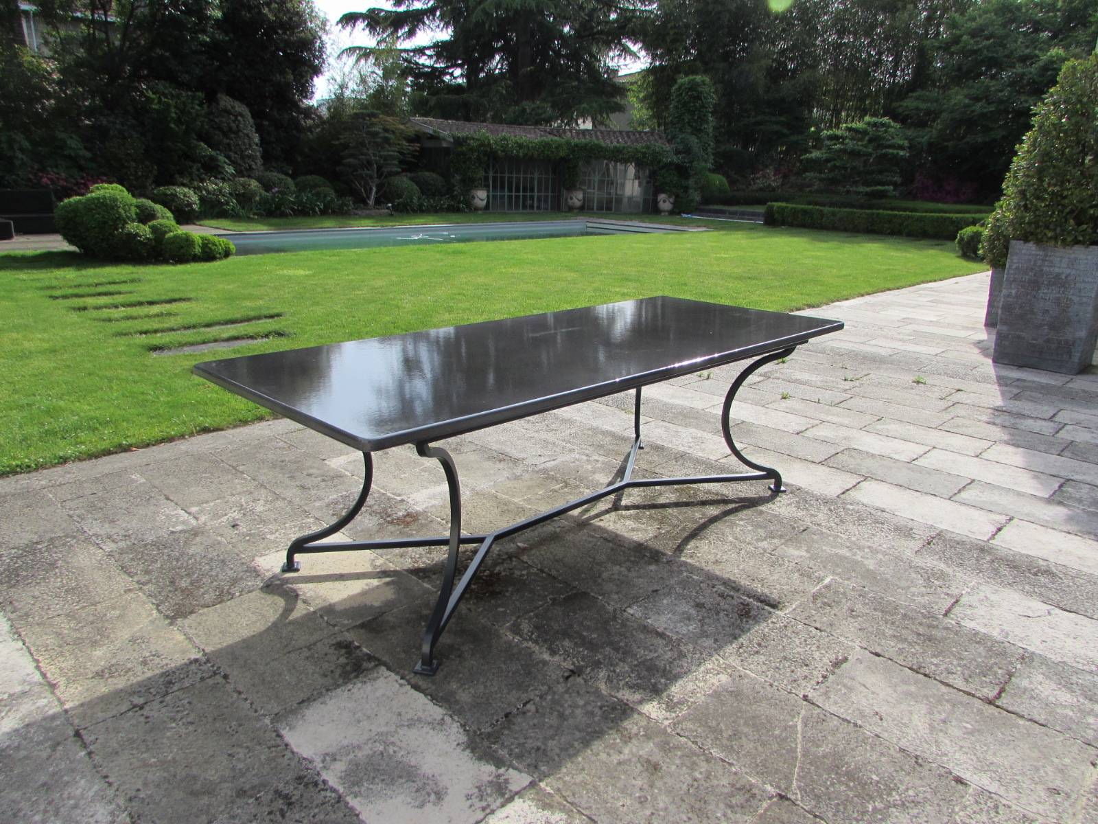 L'atelier artisanal LAVASTONE à Toulon a réalisé pour une cliente américaine qui a acquis une maison de charme en Dordogne cette table de grande taille sur un piétement de forme Château.