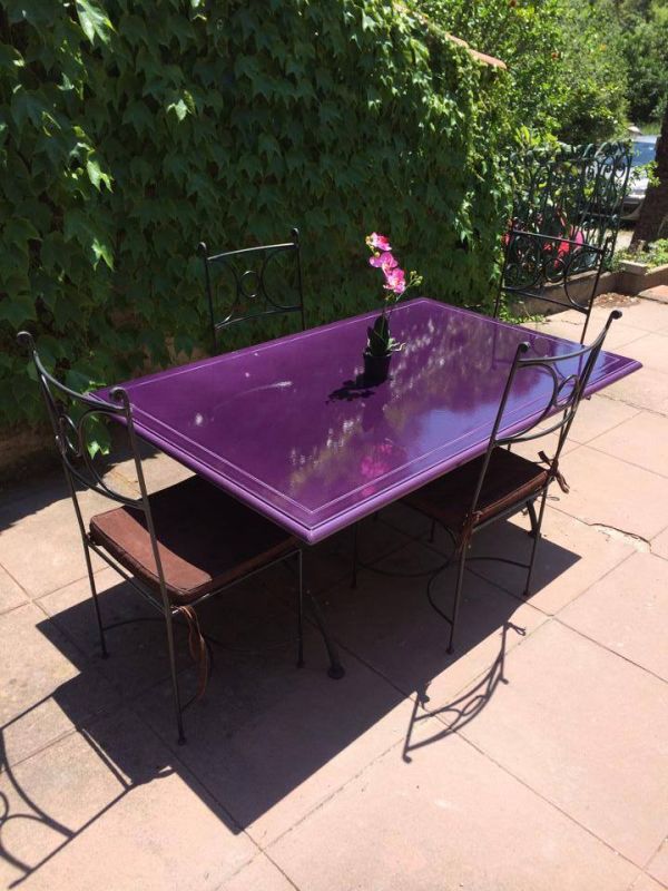 Lavastone a réalisé cette magnifique table de 180 x 90 cm avec bec de corbin avec liseré couleur Figue