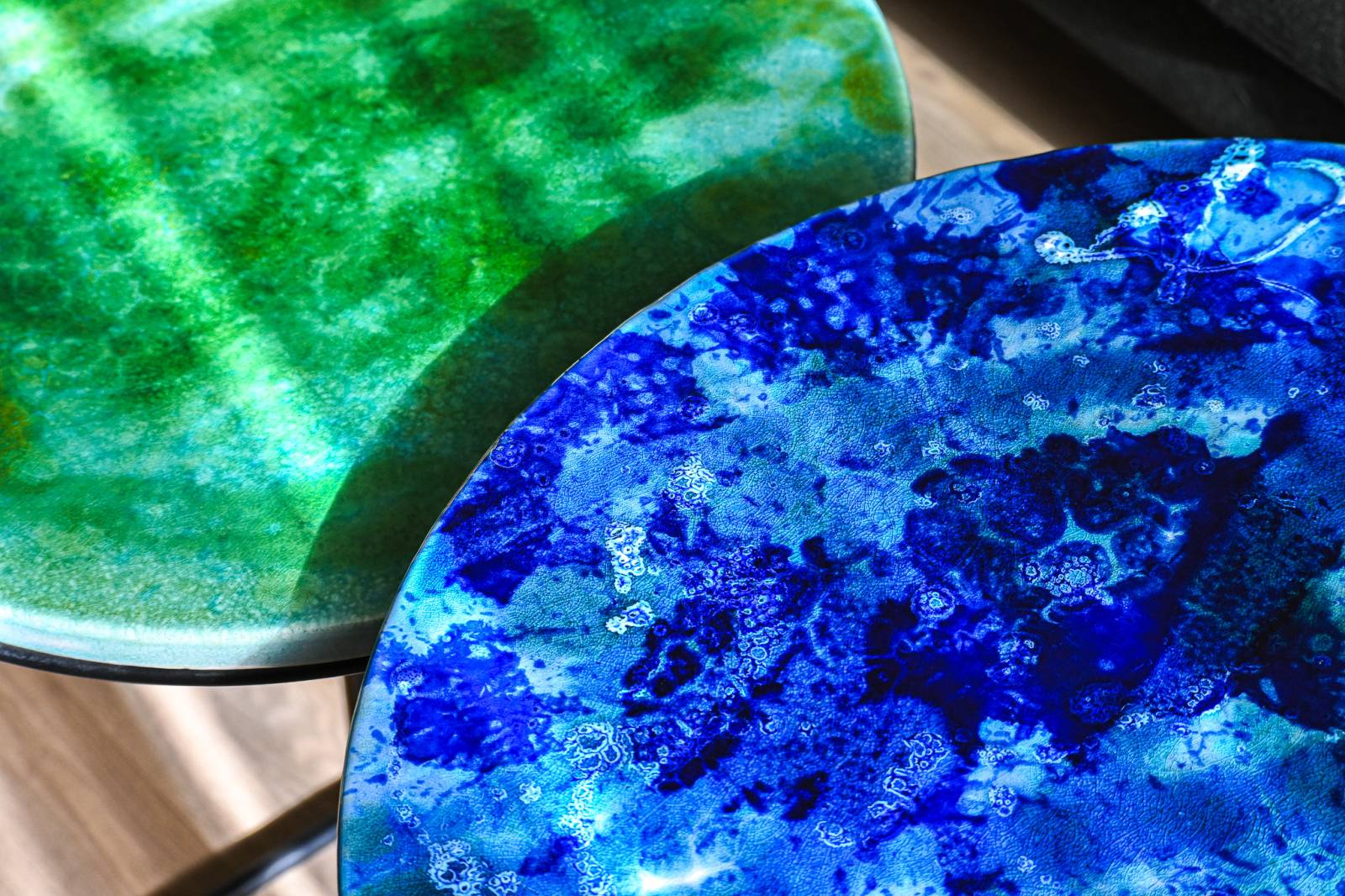 Portée à 1000 °C, la matière révèle toute sa magie : l’émail se transforme en un cristal fondu, fusionnant avec la lave pour créer une surface d’une beauté rare et unique.